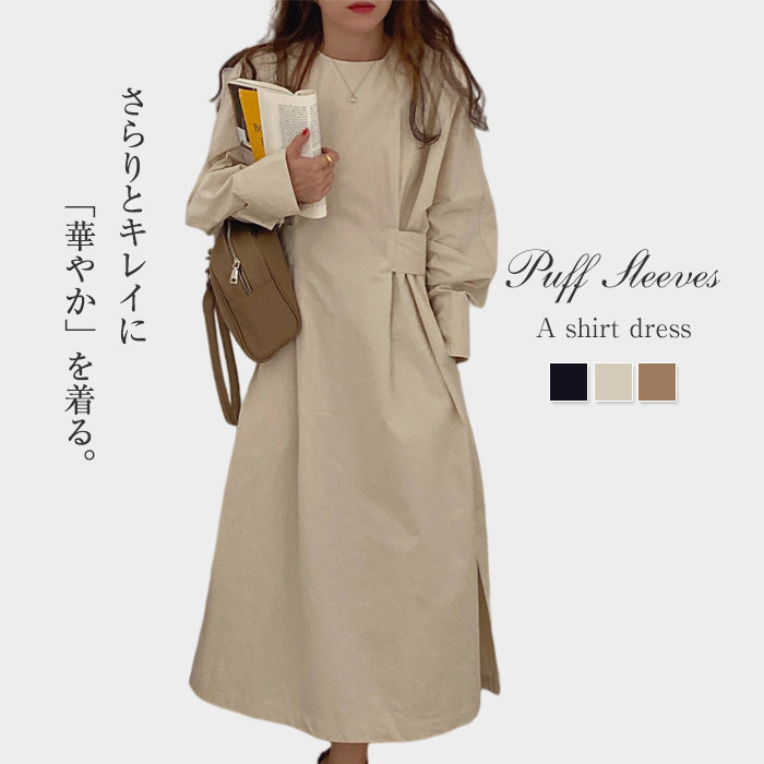 レディース Aラインワンピース シンプル ウエストマークワンピース きれいめ オフィスカジュアル 体型カバー フェミニン ボリューム袖ワンピ ロングシャツ長袖秋 膝丈ワンピース大人
