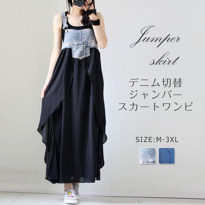 レディース ジャンパースカート デニム 夏 ノースリーブ キャミソール ゆったり 大きいサイズ 無地 可愛い 136