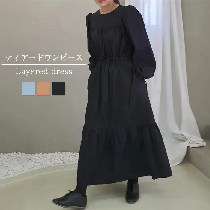 ワンピース 春 長袖 きれいめ ティアードワンピース レディース ロングワンピース クルーネック マキシワンピース マキシ丈 きれいめ 大人 プルオーバー ゆったり カジュアル エレガント シンプル