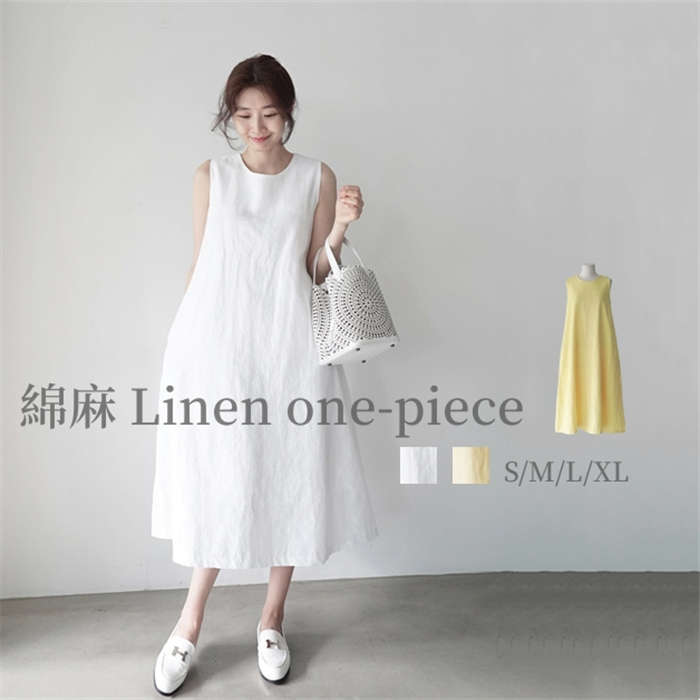 季節感Up~ 綿麻素材 ノースリーブワンピース Linen onepiece レーモンイエロー ホワイト 白 S~2XL 大きいサイズ 春夏 プレゼント 贈り物 ギフト 誕生日 母の日 ♪
