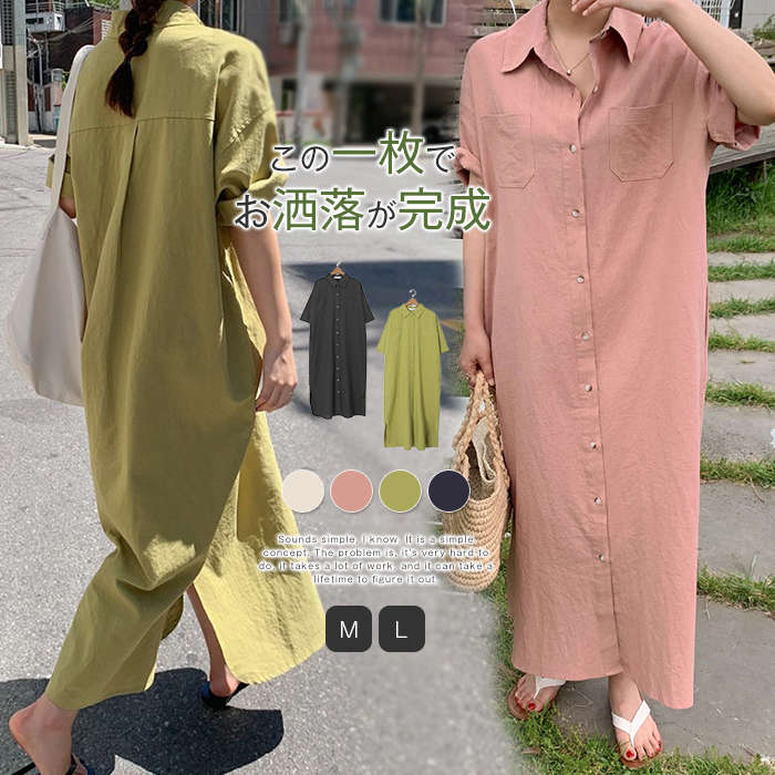 熱い季節に対応 使い回し マキシ丈 シャツワンピ 大きいサイズ M L イエロー ピンク グリーン ベージュ ネイビー ナチュラル おしゃれ 体型隠し 二つの腕カバー 薄手 涼しい ♪