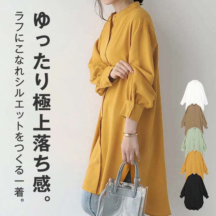 スタンドカラー ロングシャツワンピース Long Shirt 白 ホワイト グリーン 緑 イエロー 黄 キャメル ブラック 黒 春夏 春秋 プレゼント 贈り物 ギフト 母の日 UV 冷房対策 ♪