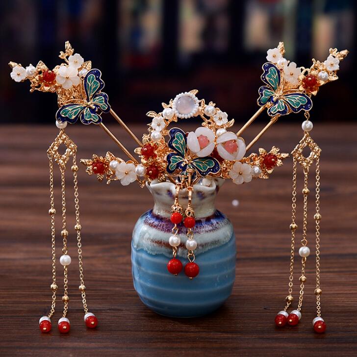 かんざし 蝶モチーフ 古風髪飾り セット 華流 コスプレ 中華風ヘアアクセサリー ハロウィン 髪飾り ヘアピン 簪 イヤリング フリンジアクセサリー 蝶 花 撮影道具 漢服唐装に相性