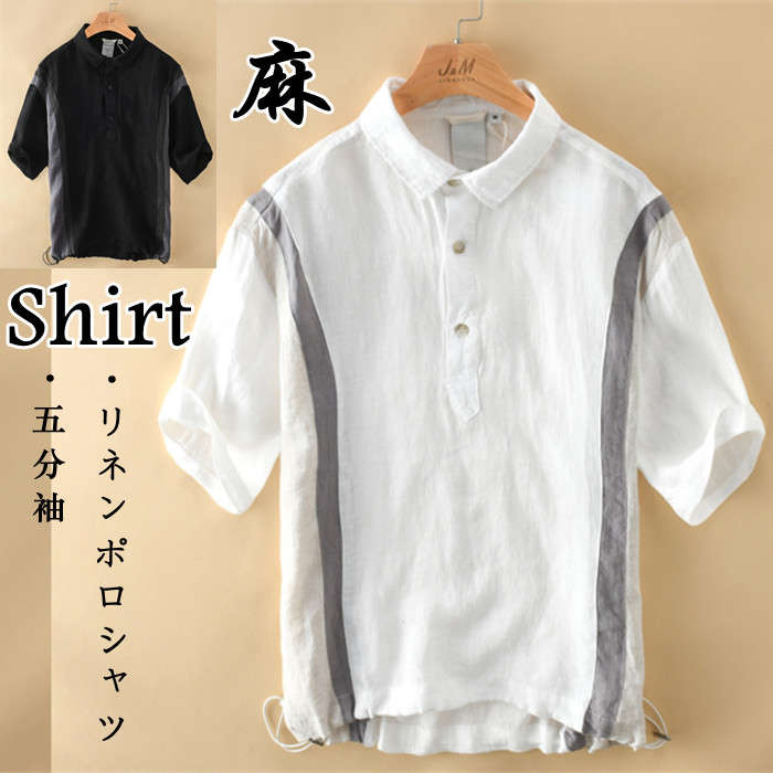 亜麻 五分袖ポロシャツ ヘンリーネック ジャージポロシャツ カジュアル 男性用 トップス 夏服 2色 黒色 白色