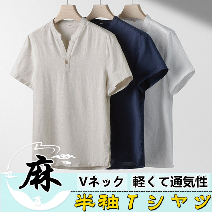 Tシャツ リネンTシャツ 半袖Tシャツ メンズ Vネック カジュアルTシャツ T-shirt 亜麻 トップス シンプル 無地 夏物 新品