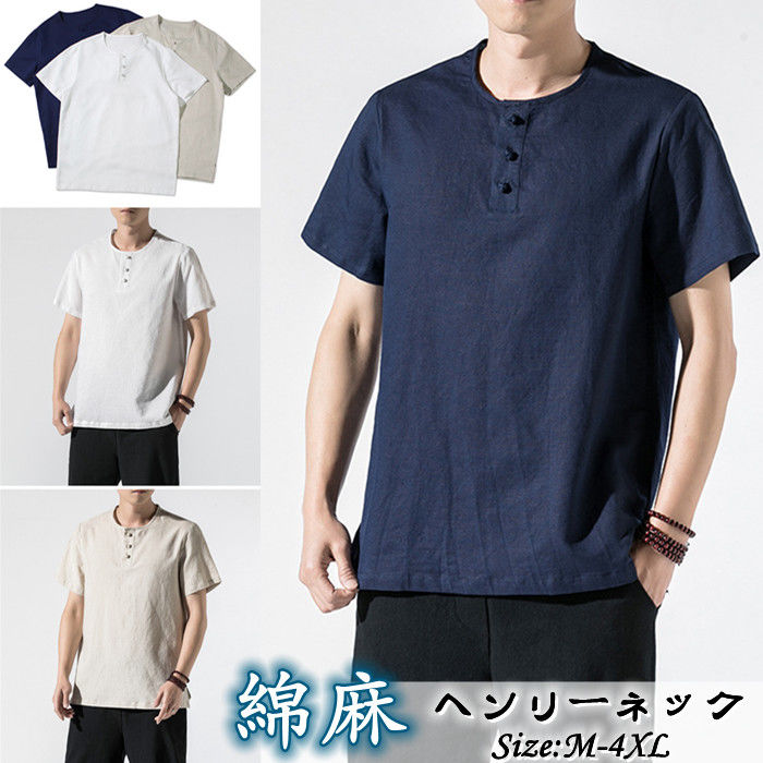綿麻 半袖Tシャツ カジュアル 男性用 ヘンリーネック トップス 夏物 3色 白色メンズファッション トップス シャツ カットソー