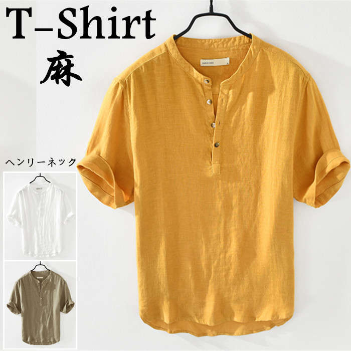 亜麻 半袖シャツ 五分袖 ヘンリーネック 立ち襟 カジュアル 男性用 トップス 夏服 3色 白色 灰色 黄色