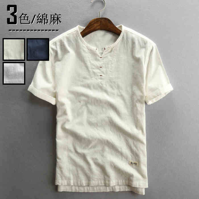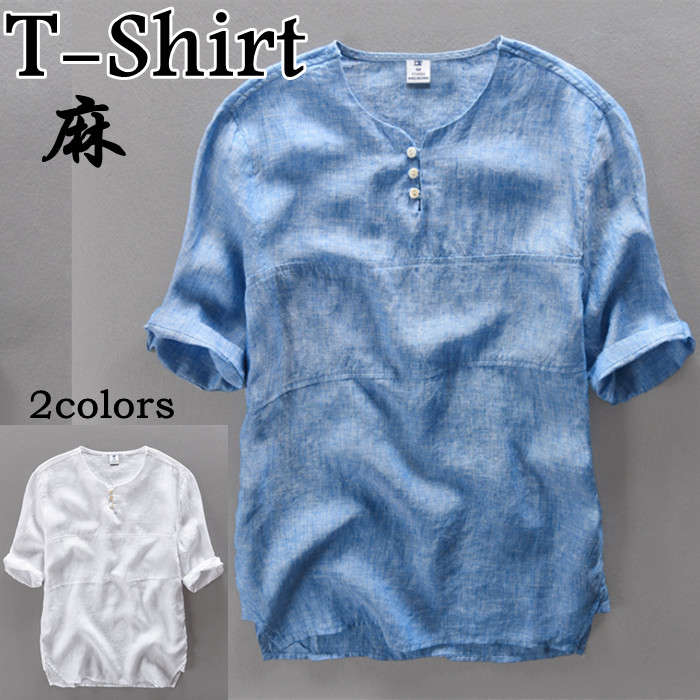 綿麻 半袖Tシャツ 丸首 ヘンリーネック カジュアル 男性用 トップス 夏物 2色 白色メンズファッション トップス シャツ カットソー