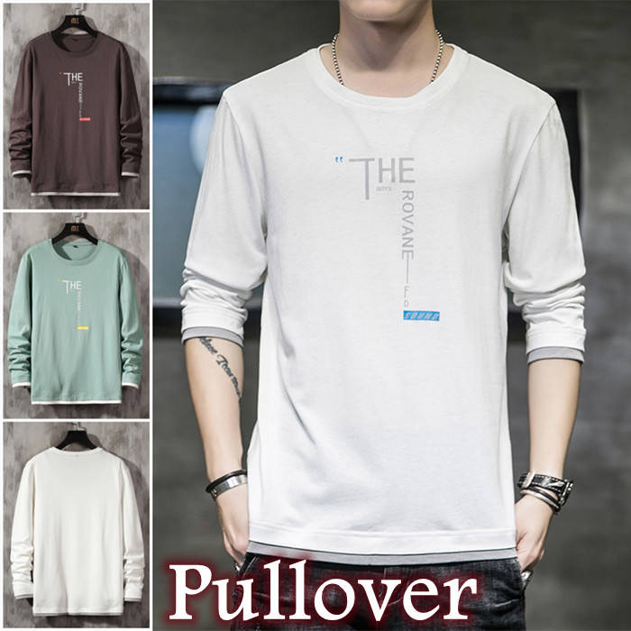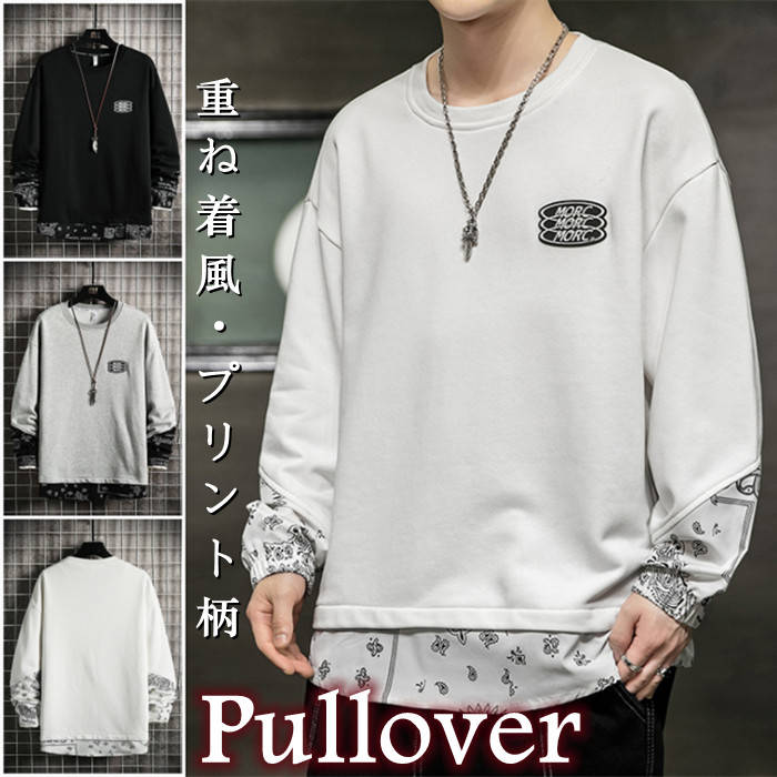 プルオーバー 長袖Tシャツ レイヤード カジュアルTシャツ プリント柄 トップス 男性用 春秋服 3colors 灰色 黒色 白色