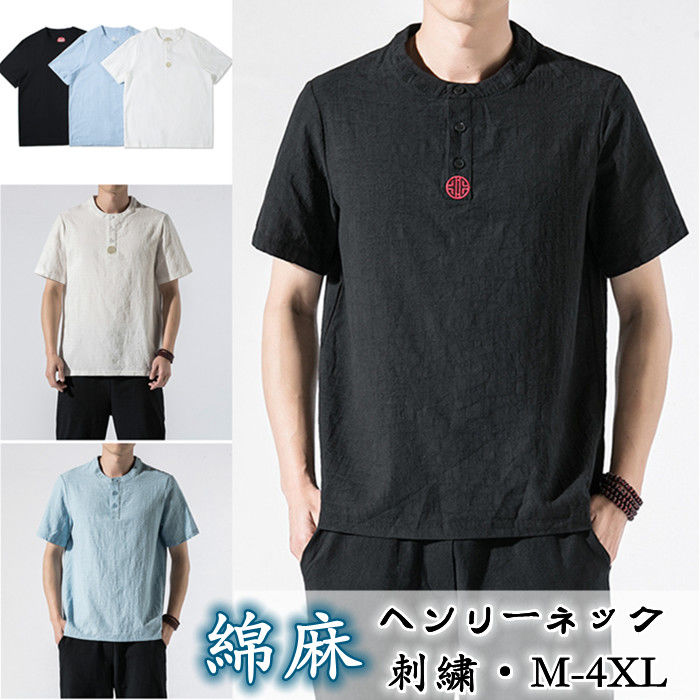 綿麻 刺繍 半袖Tシャツ カジュアル ヘンリーネック トップス 男性用 夏物 3色 白色 黒色メンズファッション トップス シャツ カットソー