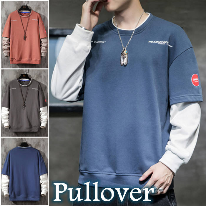 プルオーバー 長袖Tシャツ レイヤード カジュアルTシャツ 切り替え柄 トップス 男性用 春秋服 3colors 黒色 赤茶 藍色