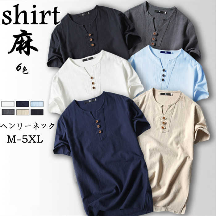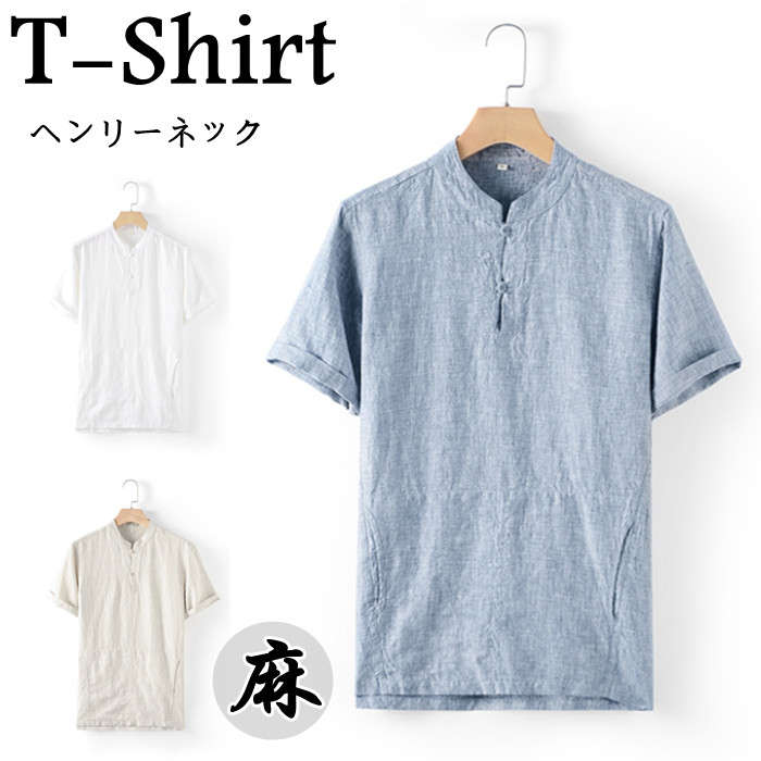 Tシャツ リネンTシャツ 半袖Tシャツ メンズ ヘンリーネック カジュアルTシャツ - -5 綿麻 トップス シンプル 無地 夏物 新品