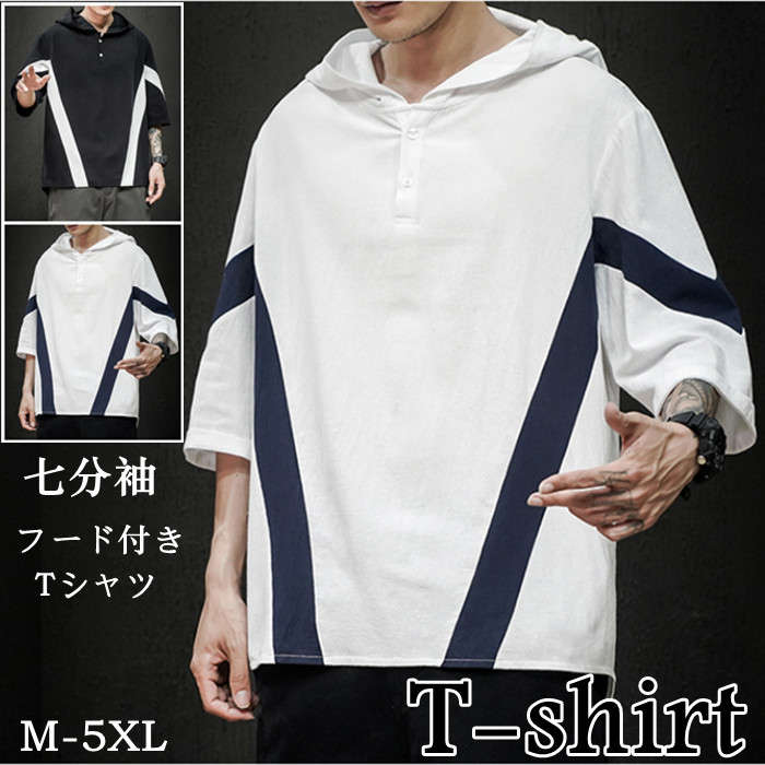 男性 フーディー 七分袖Tシャツ 切り替え柄 プルオーバーパーカー 夏服 紺 黄 黒 白メンズファッション トップス シャツ カットソー