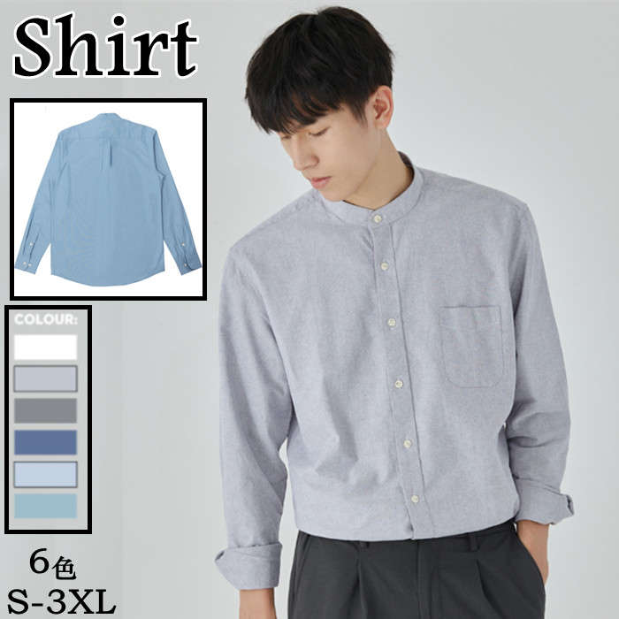 立ち襟 オックスフォードシャツ コットン 長袖 トップス 6色 豆がら茶 灰色 白色 藍色 水色 浅縹