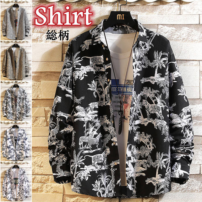 プリント柄 ゆったり風 長袖 カジュアルシャツ 男性用 トップス 4 白色 黒色メンズファッション トップス カジュアルシャツ