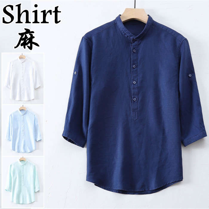 亜麻 七分袖シャツ 接触冷感 カジュアル 開襟シャツ 男性用 立ち襟 トップス 夏物 ギフト 3色 白色 灰色