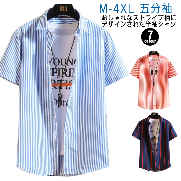 ストライプシャツ メンズ 半袖 カジュアルシャツ 半袖シャツ ノーアイロンシャツ tシャツ 五分袖 バック長め カジュアルシャツ ビジネス ビッグシャツ 快適 スリム ビジネスシャツ 新作 ゆったり