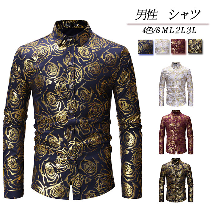 ステージ衣装 メンズ シャツ 男性 花柄シャツ 忘年会 新年会 発表会 ダンス衣装 舞台衣装 カラオケ衣装 マジック用 4色 ブラック ネイビー ワインレッド ホワイト 団体 ダンス 発表会