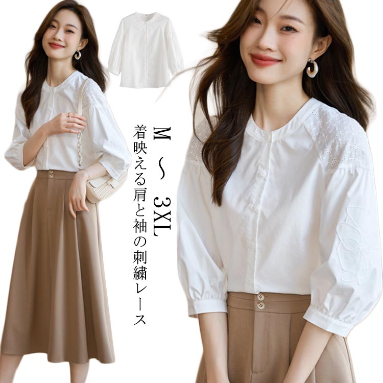 シャツブラウス カットソー シャツ 五分袖ブラウス デザイン 着痩せ きれいめ トレンド 通勤 通学 ホワイト