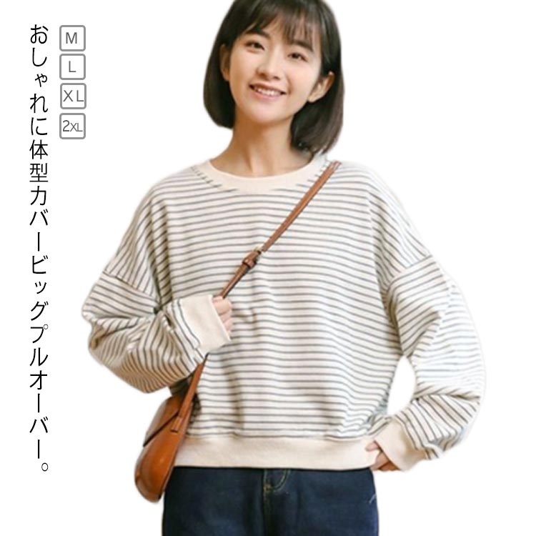 短め丈で脚長魅せが叶う 体型カバー ビッグサイズ トップス ボーダーtシャツ トレーナー ラウンドネック パーカー こなれ感 スウェット