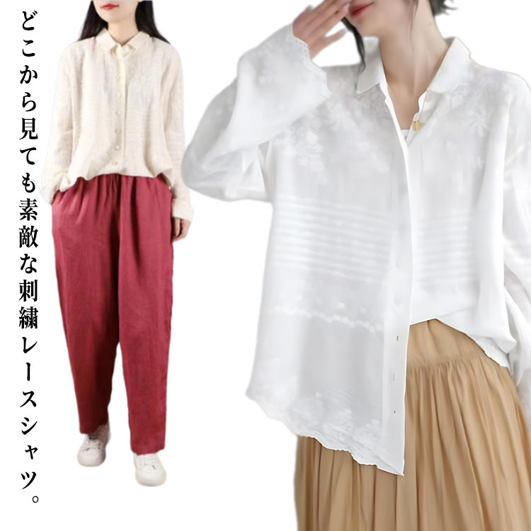 高級感 羽織り 透け感 ブラウス 刺繍トップス 前開き 長袖ブラウス レースブラウス 冷房対策 刺繍レース