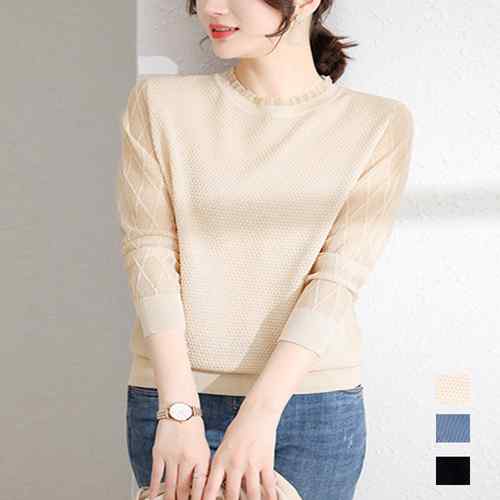 プルオーバー オフィス通勤 トップス セーター 長袖 ラウンドネック フリル きれいめ 春秋 お洒落ニット 韓国風ニット ファッション 無地 薄手 透け感ニット ニットソー 通勤服