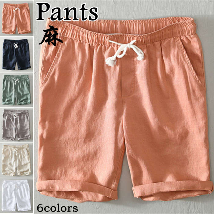 麻100% 男性用 リネンパンツ ショートパンツ 無地 ビーチ チノパン 夏 6色 白色 灰色 緑色