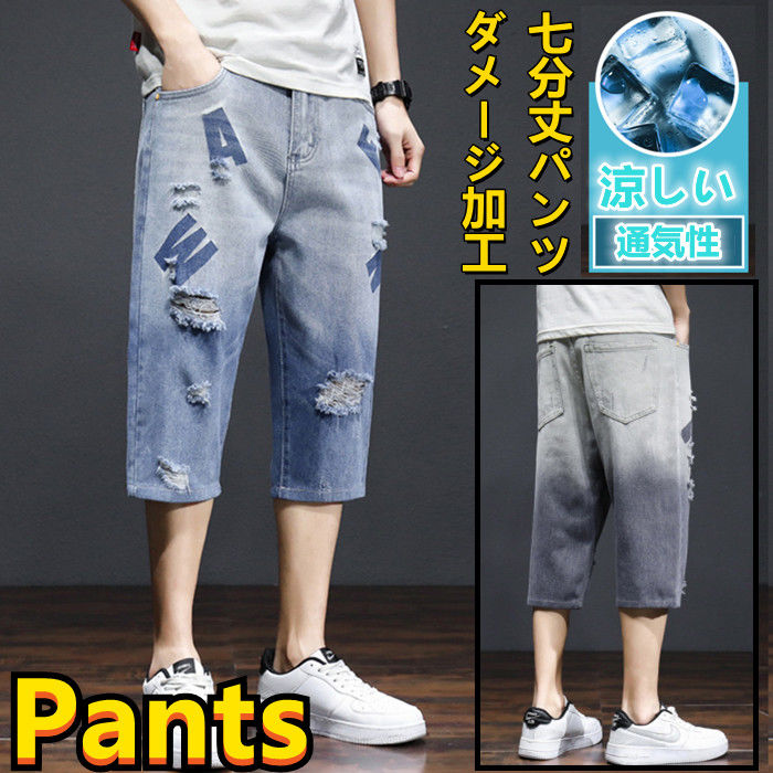 春夏新作 ジーンズ ダメージ加工 デニムパンツ 男性用 クラッシュ 七分丈パンツ ブルー 2