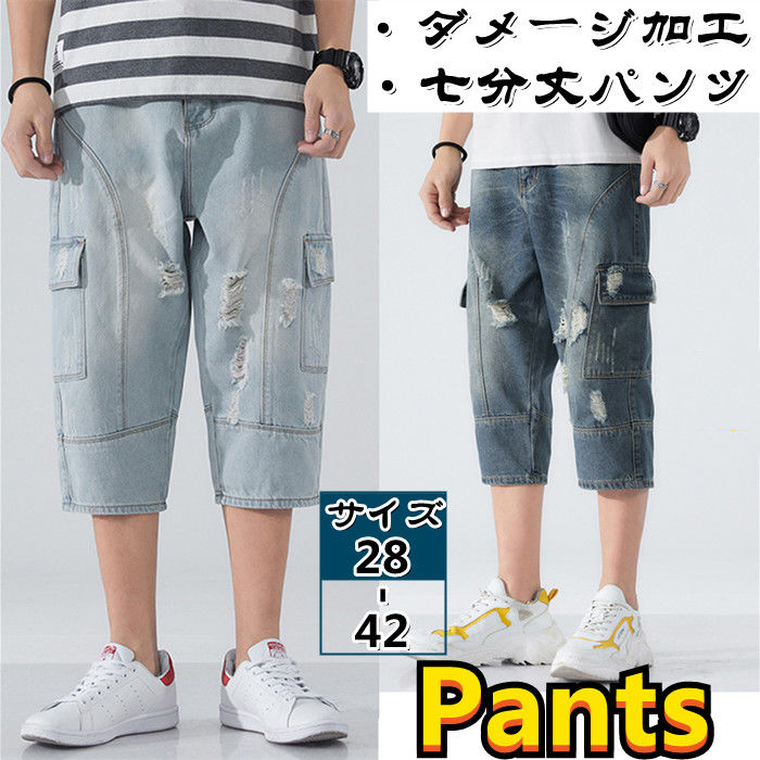 春夏新作 ジーンズ ダメージ加工 デニムパンツ 男性用 クラッシュ 七分丈パンツ ブルー 2colors