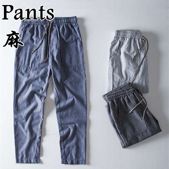 綿麻 春夏新作 男性用 ストライプ柄 ワイドパンツ 薄手 リネンパンツ 3 灰色 黒色 藍色