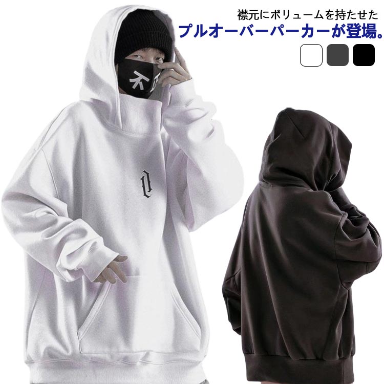 フード付き メンズ ボリュームネック ハイネック プルオーバー パーカー ビッグシルエット 大きめ 原宿風