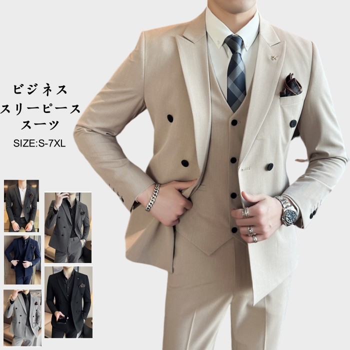 3ピース スーツ セット テーラードジャケット ロング丈 九分丈 パンツ ベスト 男性用 無地 大きいサイズ S-7XL 6colors 黒色 灰色