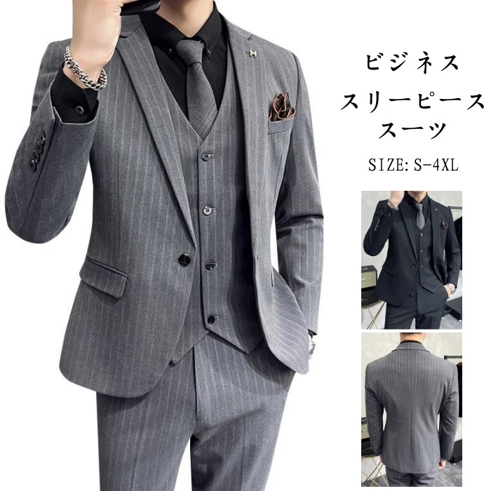 3ピース スーツ セット テーラードジャケット ストライプ柄 ロング丈 九分丈 パンツ ベスト ビジネス 男性用 S-4XL 2colors 灰色
