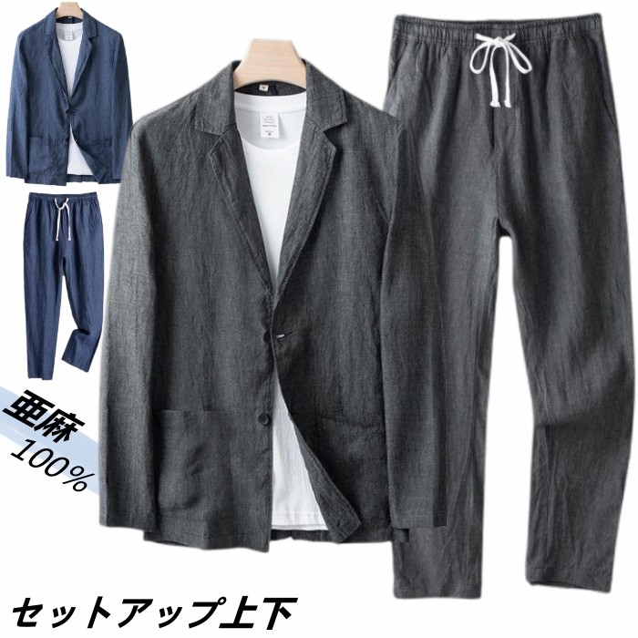 接触冷感 亜麻 100% 2ピース スーツ 上下セット テーラードジャケット パンツ 春夏品 男性用 無地 通気性 2colors 藍色 灰色
