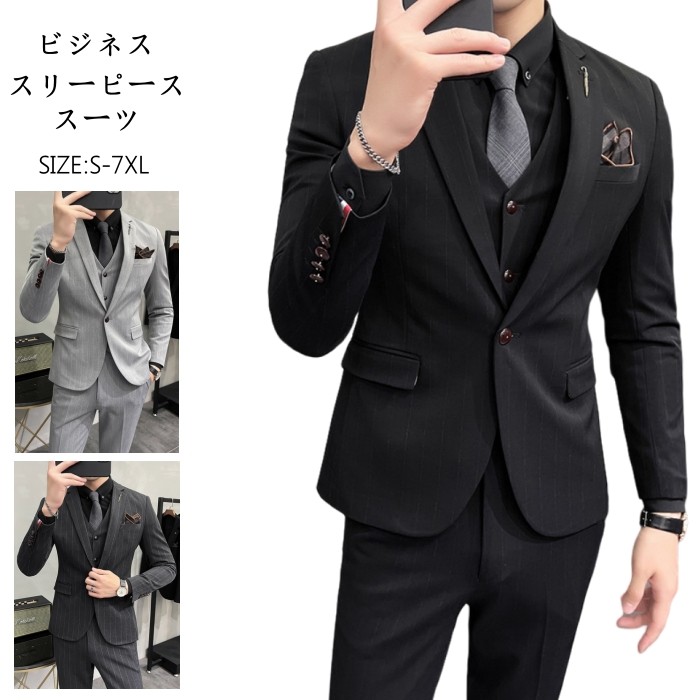 3ピース スーツ セット テーラードジャケット ロング丈 九分丈 パンツ ベスト 男性用 ストライプ柄 大きいサイズ S-7XL 3colors 黒色 灰色