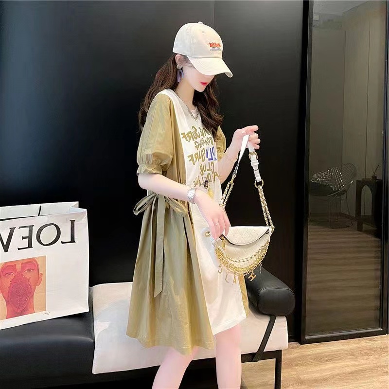 シャツワンピース レディース 夏 ゆったり 英文字 リボン付き カジュアル 半袖 可愛い 丸首 ブラック イエロー 051