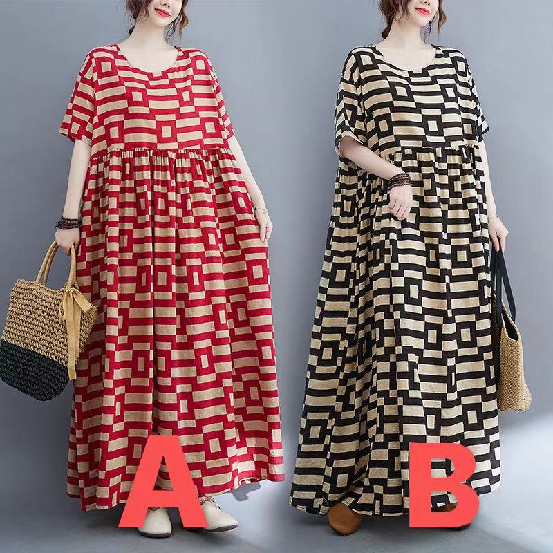 レディース ロングワンピース 夏 ゆったり 半袖 大きいサイズ 丸首 綿 総柄 幾何柄 可愛いレディースファッション ワンピース