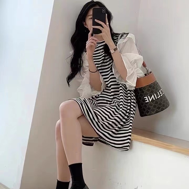 ワンピース レディース 夏 ゆったり 可愛い 薄手 丸首 カジュアル ボーダー柄 五分丈袖 2 042