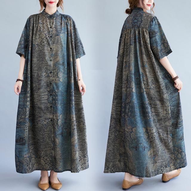 レディースシャツワンピース ロング 夏 ゆったり 総柄 半袖 綿麻 大きいサイズ 可愛いレディースファッション ワンピース
