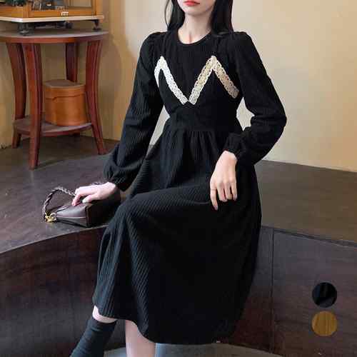 大人可愛い ロングワンピース 厚手 重ね着風 レディース オシャレ ラインワンピース 長袖レトロ 体型カバー きれいめ デートワンピース黒 ハイウエスト着やせ 韓国ファッション