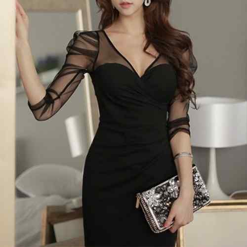 パーティードレス シースルーチュール袖 ショートタイトワンピース Vネック フェミニン お洒落 キャバクラ服 ミニドレス 黒キャバドレス安い クラブ 服装 夏 ナイトドレス ミニ