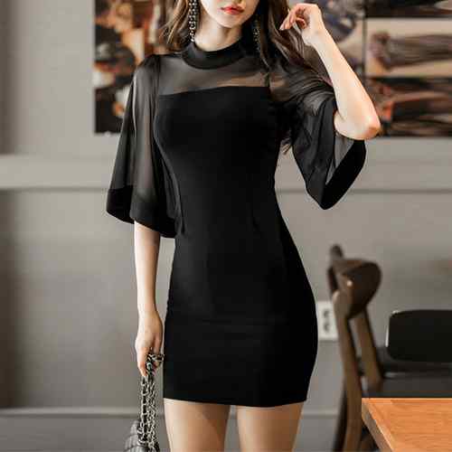 ボディコンワンピース フレアスリーブ 無地 ミニ丈クラブドレス 安いナイトドレス ハイウエスト 胸元シースルーワンピース お洒落きれいめ韓国 細身ショートドレス スリムキャバクラ服