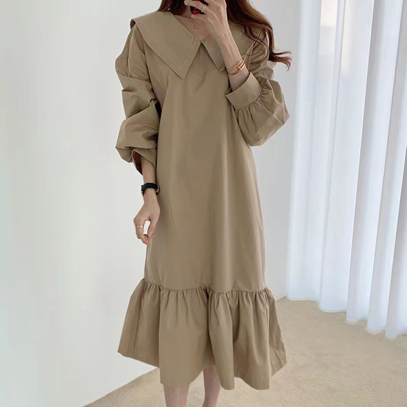 ロングワンピース レディース 春夏 ゆったり 可愛い 無地 シンプル 長袖 カジュアル 通勤 ネック ベージュ ブラック 2 019