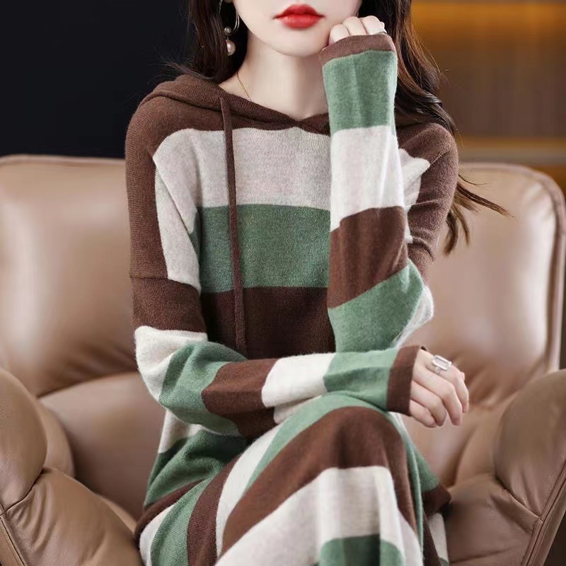 ロングワンピース レディース 春秋 セーター ニット 長袖 フード付き 通勤 ゆったり 可愛い ボーダー柄 ブラック ブラウン ベージュ 2 004