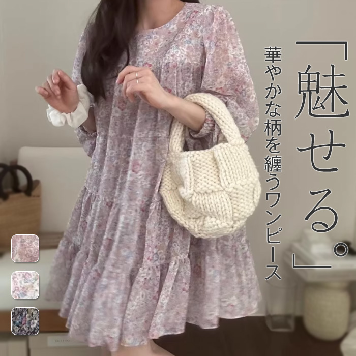 チュニック 夏 ワンピース 花柄 レディース ミニワンピース ゆったり 7分袖 クルーネック 膝上丈 かわいい 体型カバー シフォン 定番 おしゃれ きれいめ カジュアル シンプル お出かけ 涼しい