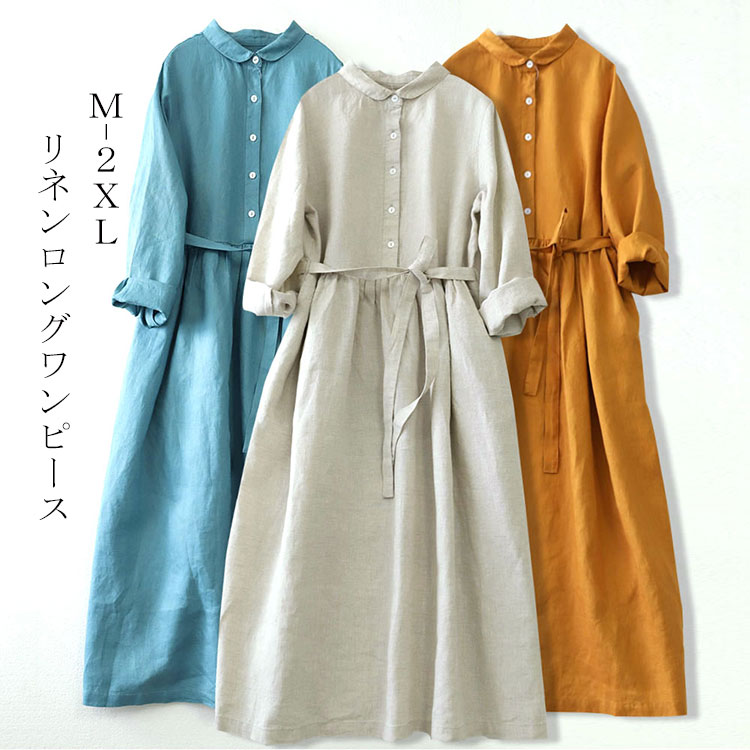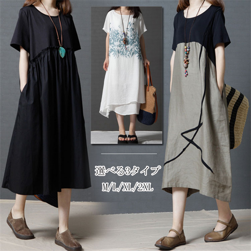 選べる3タイプ 楽チン 着心地がいい ワンピース 夏 リネン 大人可愛い オレンジ コーヒー グリーン ブラック ホワイト ネイビー M L XL 2XL
