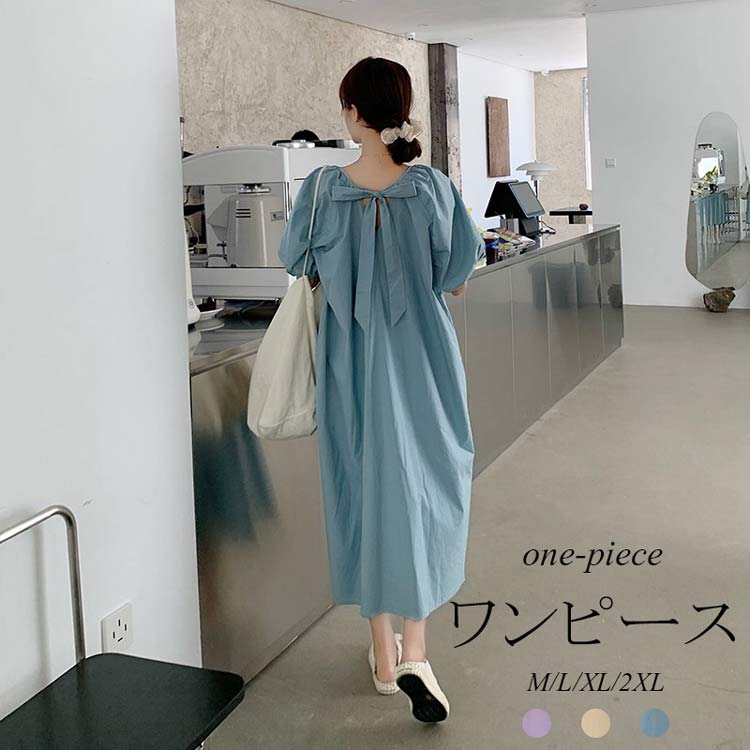 可愛いパフスリーブバックおリボン付きワンピース ロングワンピ 半袖ワンピ 夏ワンピース フレア タック入り ドッキング コクーン フレンチ風 ゆったり カジュアル 可愛い キレイメ