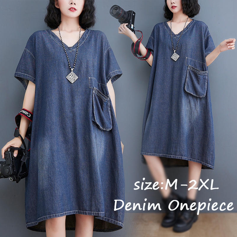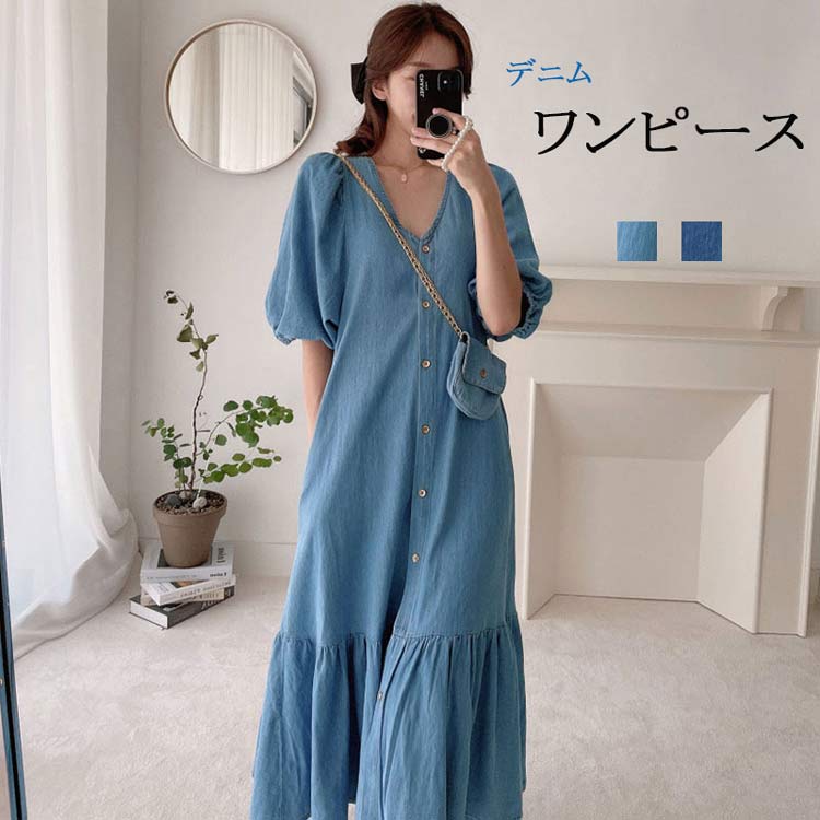 大人かわいい レディース ワンピース デニム 春夏 ビッグVネック ぽわん袖 デニムワンおうーす 大きいサイズ ロングワンピース 夏ワンピ オシャレ デザイン感 遊園地 遊び デート