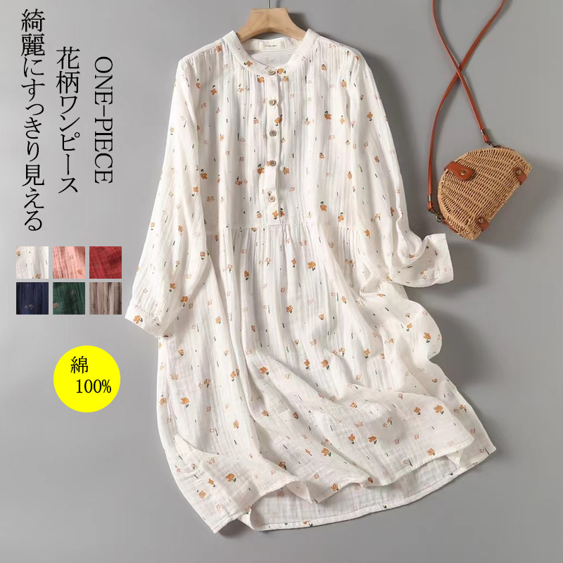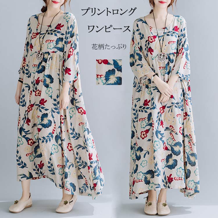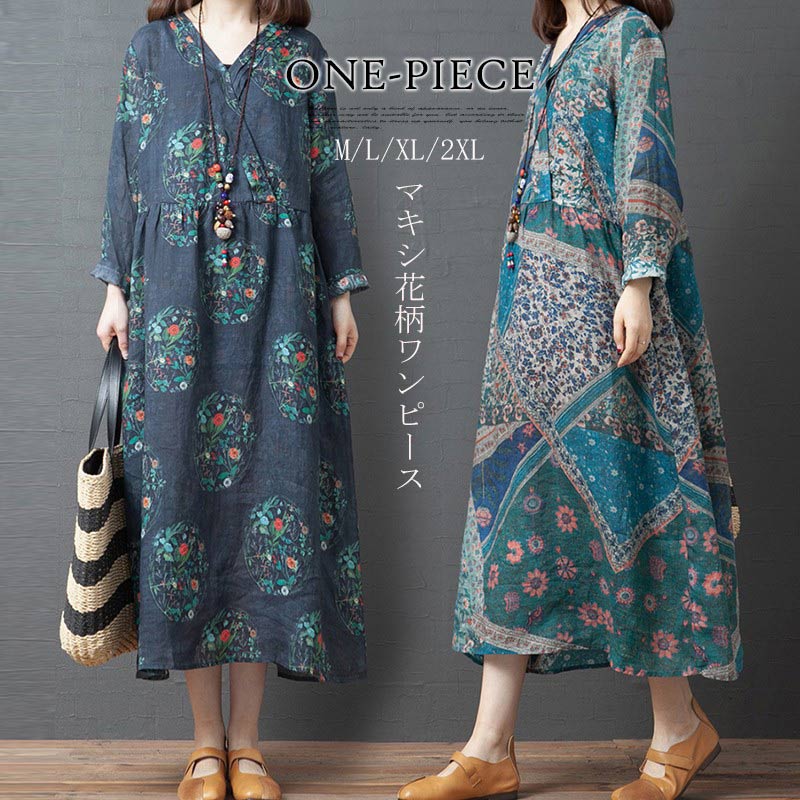 長袖ワンピース 春 秋 薄手生地 総柄 マキシワンピース マキシワンピ ロングワンピース ロングワンピ リネン ワンピ 体型カバー 着痩せ おしゃれ 秋ワンピース カジュアル