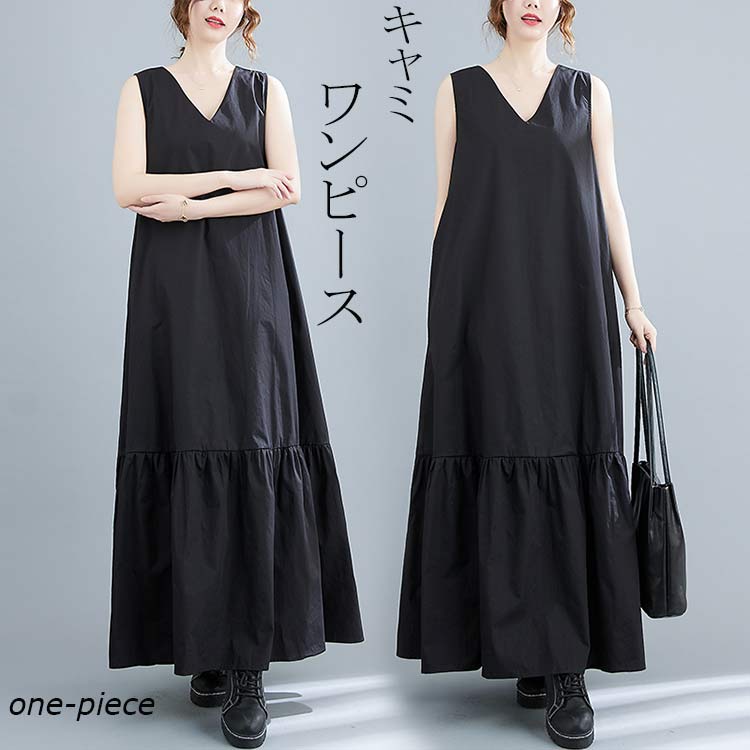夏物幅広い裾口黒フレアスカート フレアスカート キャミワンピース マキシ丈 マキシ丈ワンピース ゆったり オシャレ 細見え 袖なし 切り替え カジュアル フレア 夏
